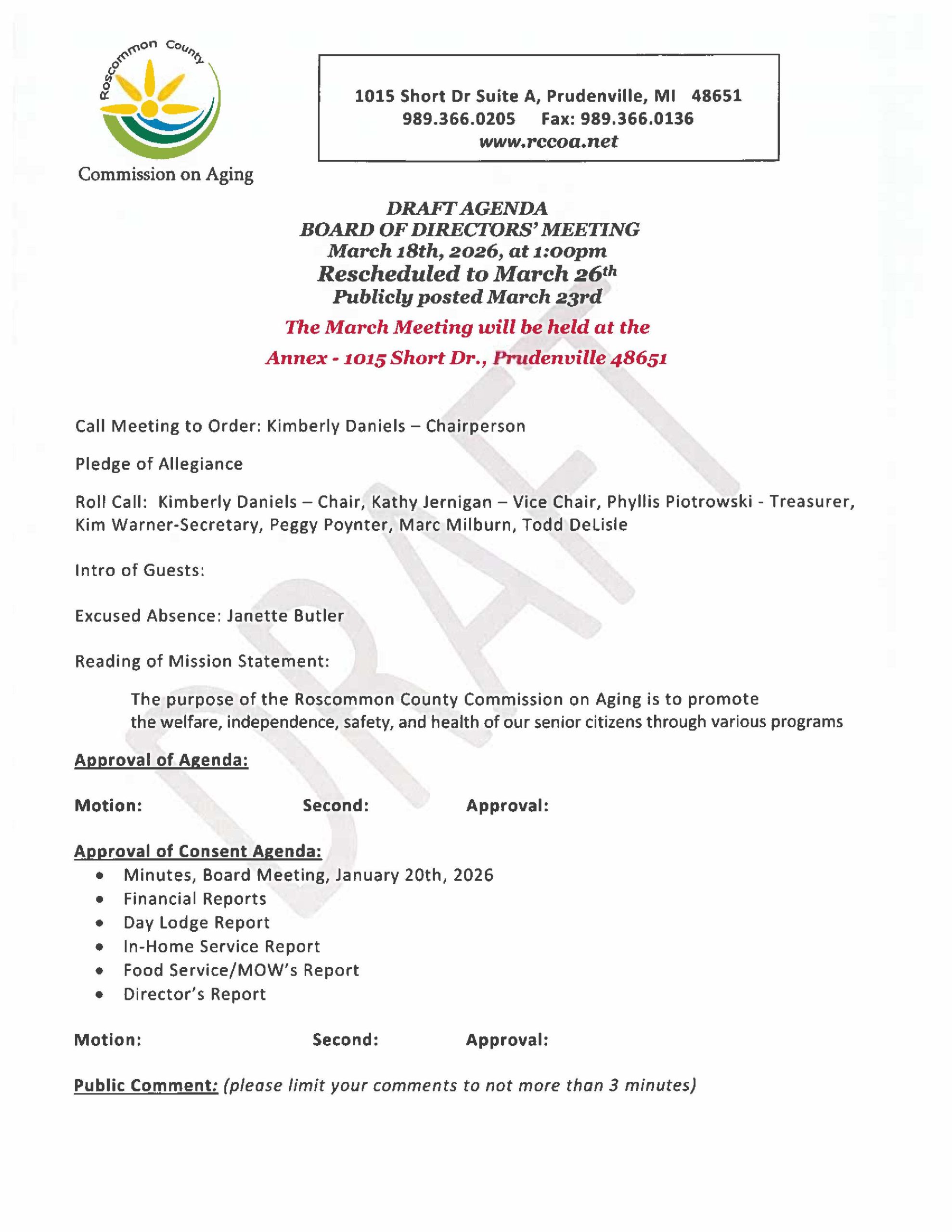 The RCCOA Mission: The purpose of the Roscommon County Commission on Aging is to promote the welfare, independence, safety and health of our senior citizens through various programs.